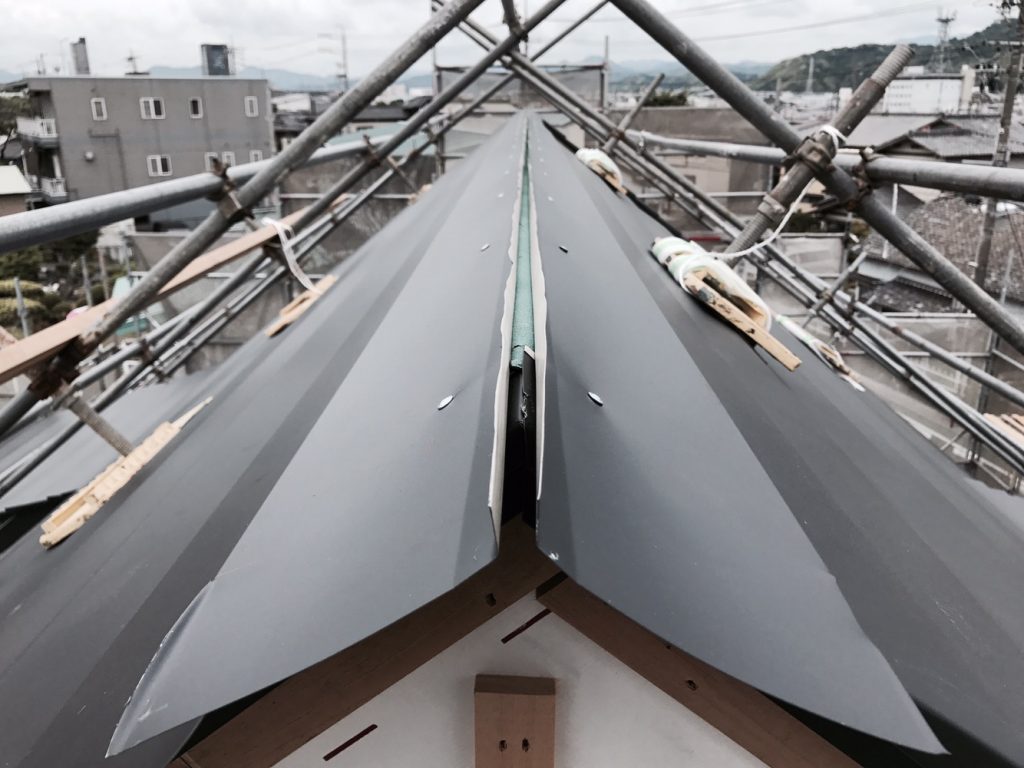 屋根工事、断熱工事、内部下地工事がすすみ、空間のカタチが徐々に現れてきました。8寸勾配の切妻屋根がそれぞれの場所の個性をつくりあげています。