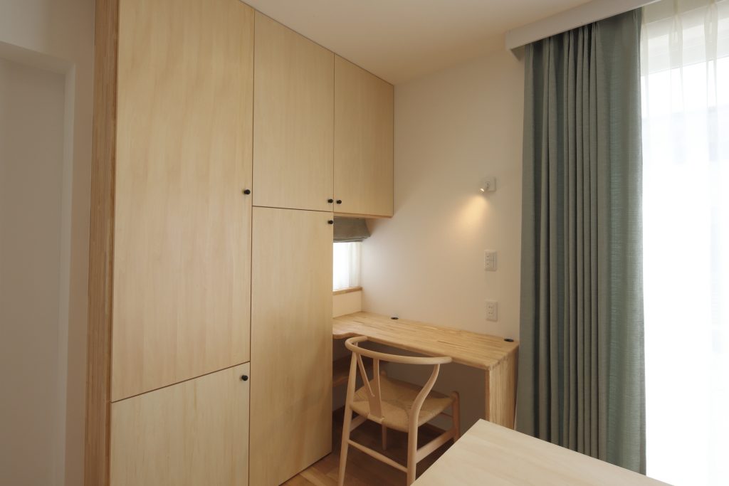 閑静な住宅地にたつ若夫婦の戸建住宅です。野球帽の鍔(つば=ブリム)のような2つの庇が外観を特徴づけています。下屋の庇は張出し構造によってポーチ部分を広く確保します。大屋根の庇は夏季の南側の直射日光を制御し、また冬季は建物内部に自然採光を導くという環境装置として機能します。内部は水周りと動線をコンパクトに抑えることによって、居住空間ができるだけ広く確保されるように計画しました。シンプルで機能的な住宅です。